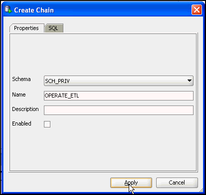 The Create Chain dialog opens. Type the Chain name as 'OPERATE_ETL' and click Apply.