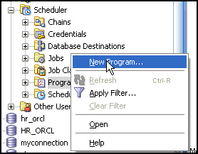 In the DBMS_SCHEDULER navigator, expand Scheduler. The various objects within the Scheduler are as follows: Credentials - are tasks that require authentication. Database Destinations - specifies a remote database instance that can be specified as a location for running a remote database job. Jobs - are a combination of schedules and programs, along with any additional arguments required by the programs. Job Classes - are resources for Jobs. Programs - contain metadata about the command that the Scheduler will run. These include external programs, stored procedures or PL/SQL blocks. Schedules - contain details about when and how often operations are executed.