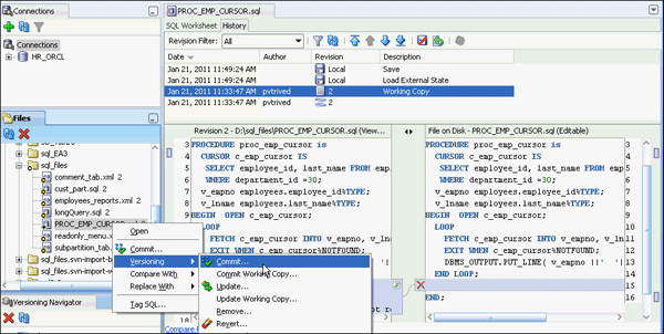 To check-in the file, in the File Navigator, right-click the file PROC_EMP_CURSOR.sql and select Versioning > Commit.