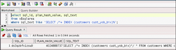 sql_id and plan_hash_value.SELECT /*+ INDEX (customers cust_yob_bix)*/ *