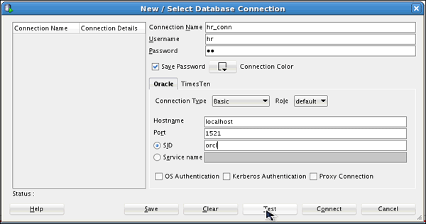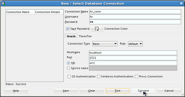 Check for the status of the connection on the left-bottom side (above the Help button). It should read Success. Click Save and then click Connect.