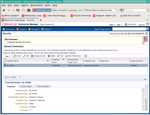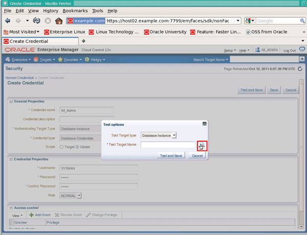 In the "Create Credential" region, enter a credential name of IM_Admin (or the super-administrator you created earlier) and from the "Authenticating Target Type" dropdown list, select Database Instance. Change the "Scope" radio button to Global, enter a username of SYSMAN, and the password for the SYSMAN database account, then click the Test and Save button. Note: The SYSMAN database account is locked by default. Make sure you unlock the SYSMAN database account first before you move on to the next step. To unlock the account, you can either use the Database Management console in Enterprise Manager Cloud Control, or connect to the database as SYS using SQL*Plus and issue the ALTER USER sysman ACCOUNT UNLOCK command.