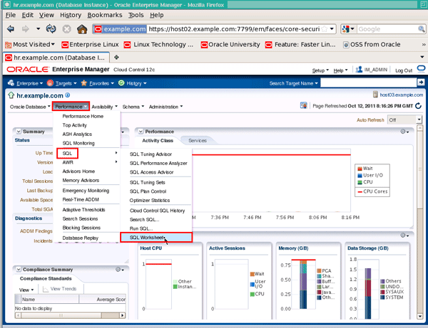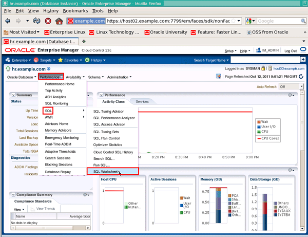 Next, select the Performance menu, followed by SQL and SQL Worksheet. Note: Make sure your browser's popup-blocker is turned off for this site.