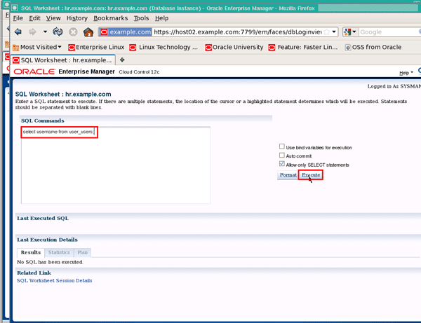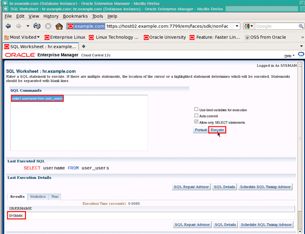 Enter the SQL command select username from user_users; (if not already entered for you) then click the Execute button. The "Results" region should show a value of "SYSMAN":
