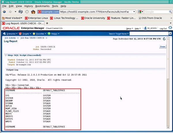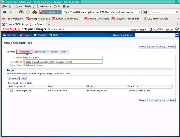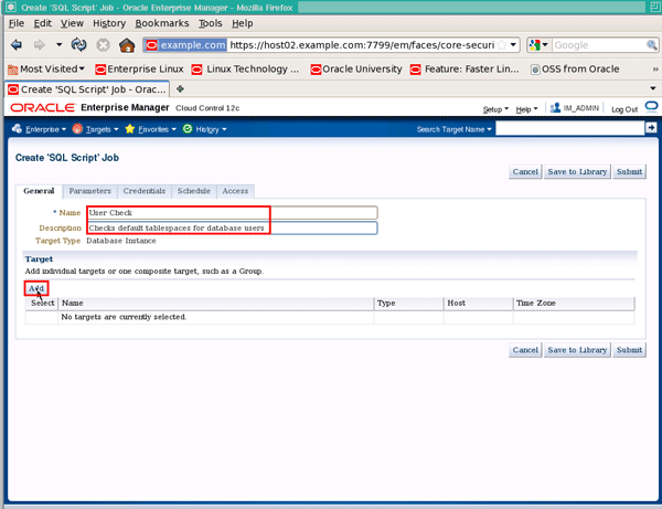 On the "Create 'SQL Script' Job" page, enter a name of User Check, a description of Checks default tablespaces for database users and click Add to add targets to the job: