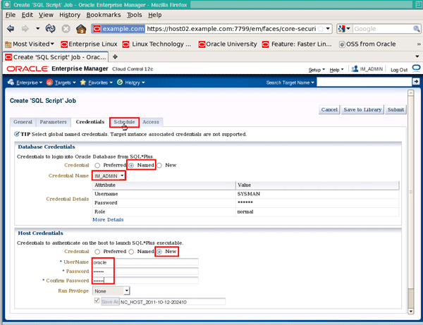 On the "Credentials" tab page, click the Named Credential radio button. If the credential name "IM_Admin" doesn't appear by default, select it from the Credential Name dropdown list (if there are no named credentials here, it probably means you created the named credential as target specific, rather than global, so you will need to edit the named credential to be global before proceeding). In the "Host Credentials" region, click New Credential since we have not yet created any host credentials, and enter a username and password of oracle (or if this is not the username and password for the ORACLE user defined on your host, enter the values that match your system here). Then click the Schedule tab: