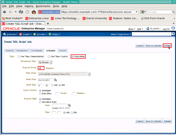 The default schedule is to run the job immediately, so click the Repeating radio button and enter a "Repeat Every" value of 30 minutes, then click the Submit button. Note: For the purposes of this tutorial, you could also just use the default schedule of One Time (Immediately) so that you can more quickly see the results from the job run.