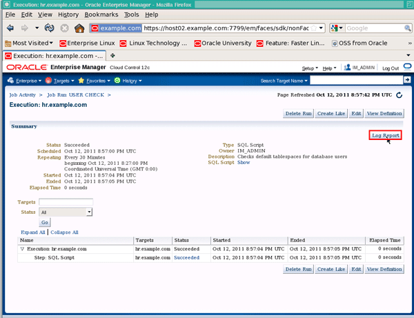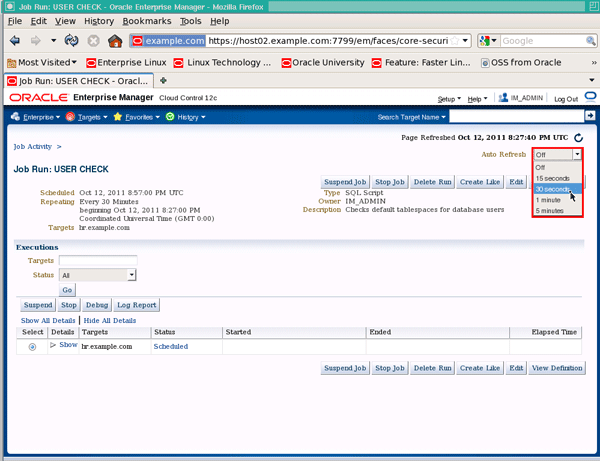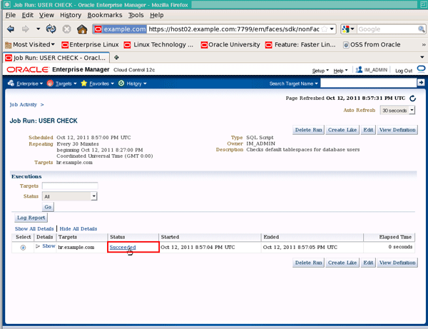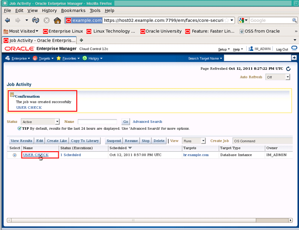 You should see confirmation window, and the job "USER CHECK" should be listed with a status of "1 Scheduled". Click the job name to drill into the "Job Run: USER CHECK" page: