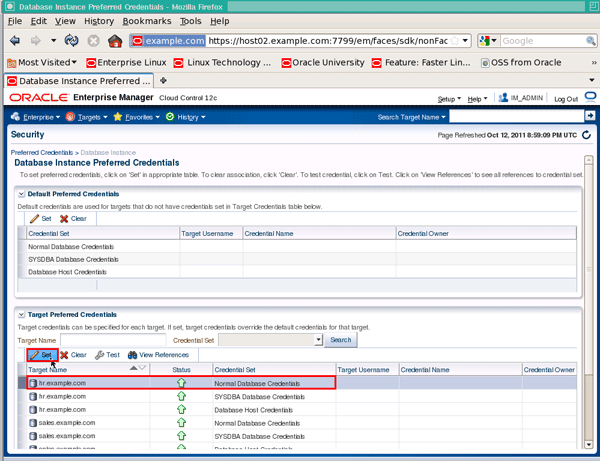 On the "Database Instance Preferred Credentials" page, select the target name hr.example.com row that has a credential set of "Normal Database Credentials" and click Set: