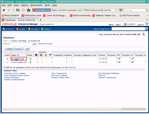 Click the database name hr.example.com (you may need to switch to Search List mode instead of the Oracle Load Map for this):