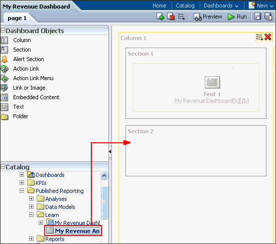 Add another Section and add the recently created analysis My Revenue Analysis to this section.
