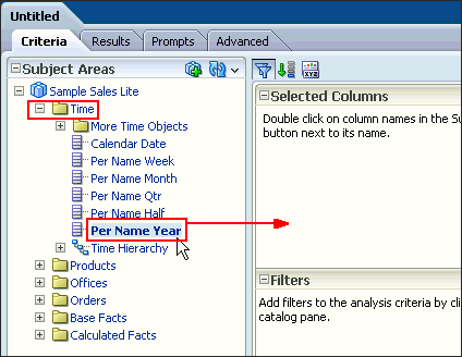 a. On the Criteria tab, select Per Name Year from the Time folder in Subject Areas and drag it to the Selected Columns area. (You can also double-click the column names to get it in the Columns area.)