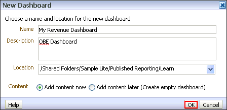 You will be prompted to choose a name and location for the new dashboard. Enter values as shown in the following screenshot. Make sure that you select the Add content now option, and then click OK.
