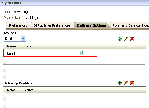 You will have to set the Delivery Options for the Oracle BI EE Account settings as Email. In the Global Header, click weblogic, and then click My Account.