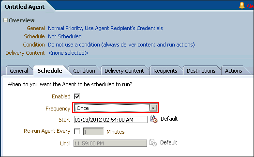Click the Schedule tab and verify that scheduling is enabled, Frequency is set to Once, and the Start date and time are set to the current date and time.