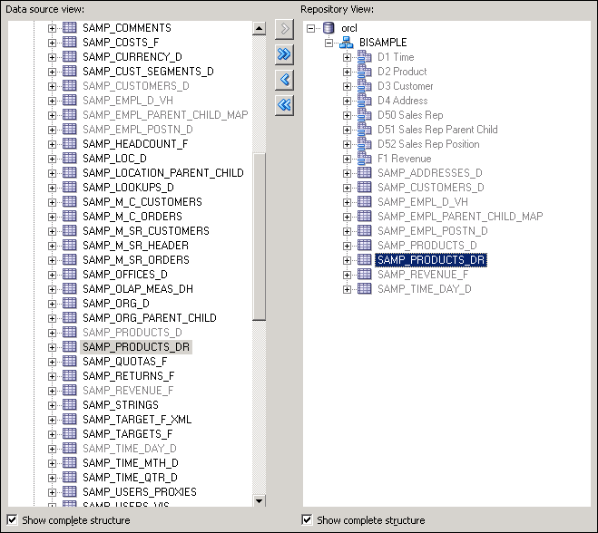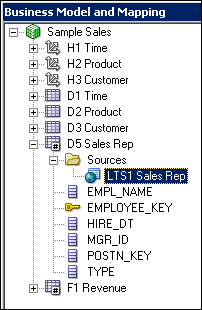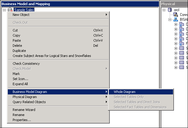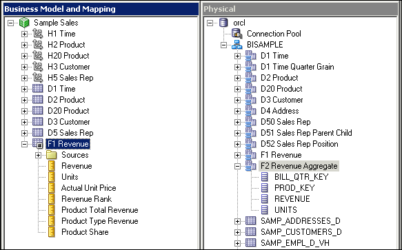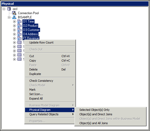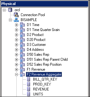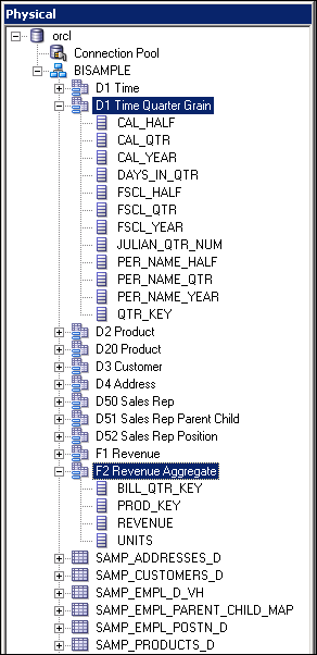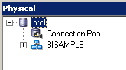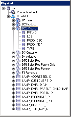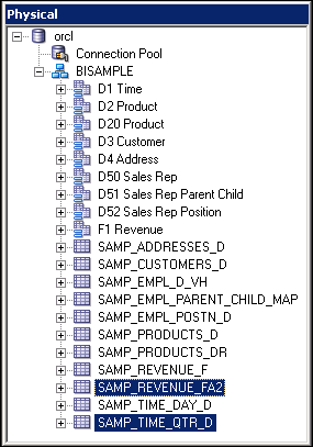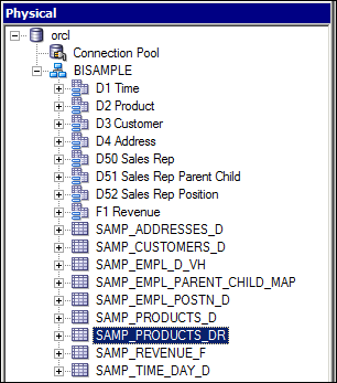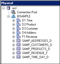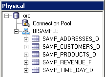 Expand orcl > BISAMPLE and confirm that the five tables are imported into the Physical layer of the repository.