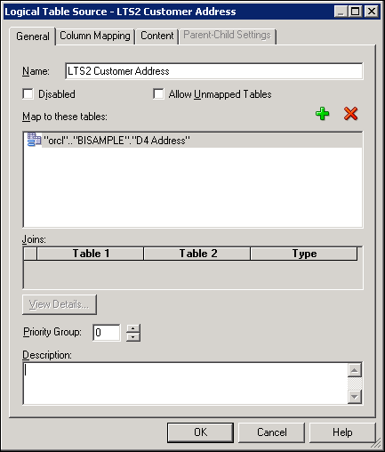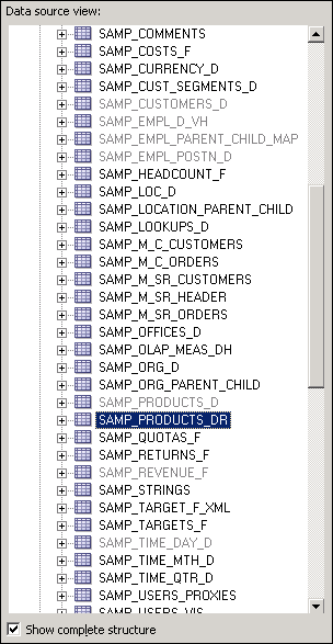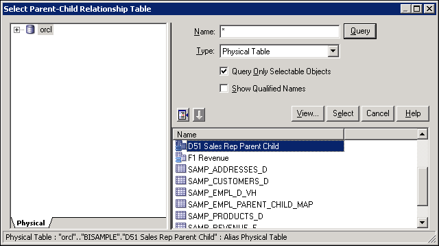 When you import metadata, many of the properties of the data sources are configured automatically based on the information gathered during the import process. After import, you can also define other attributes of the physical data sources, such as join relationships, that might not exist in the data source metadata. There can be one or more data sources in the Physical layer, including databases, flat files, XML documents, and so forth. In this example, you import and configure tables from the BISAMPLE schema.