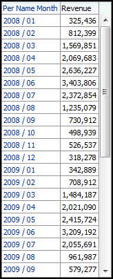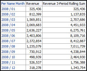Base Facts.Revenue 3-Period Rolling SumPer Name Year is equal to / is in 2008