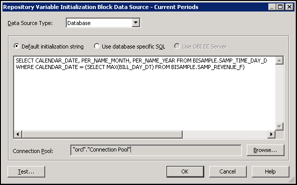 Enter user name and password for the data source. In this example the username and password are both BISAMPLE. Recall that BISAMPLE is the name of the user/schema you created in the prerequisite section.