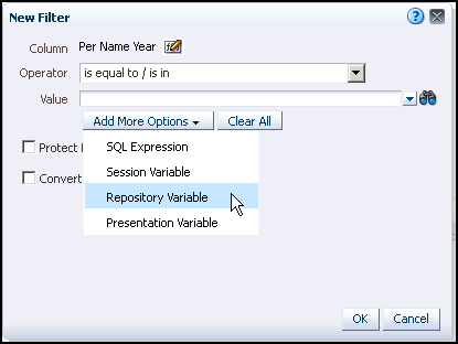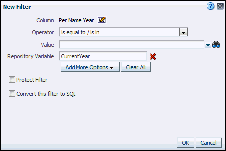 In the Repository Variable field, enter CurrentYear to create a filter for the Per Name Year column using the CurrentYear repository variable.