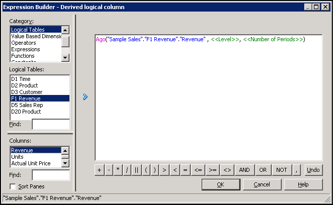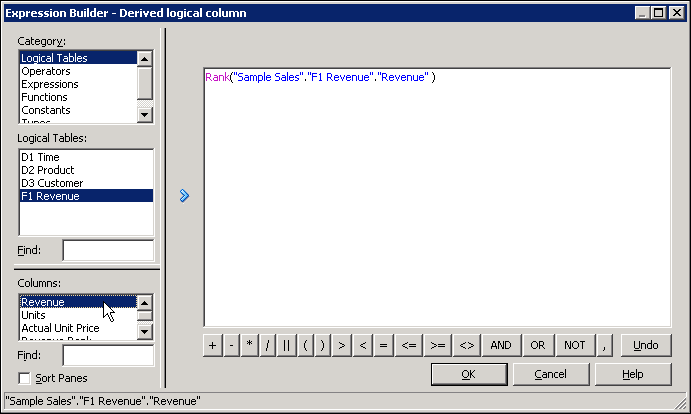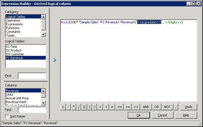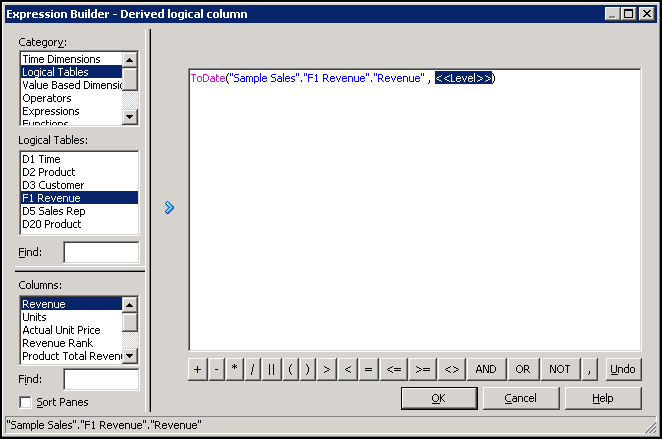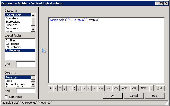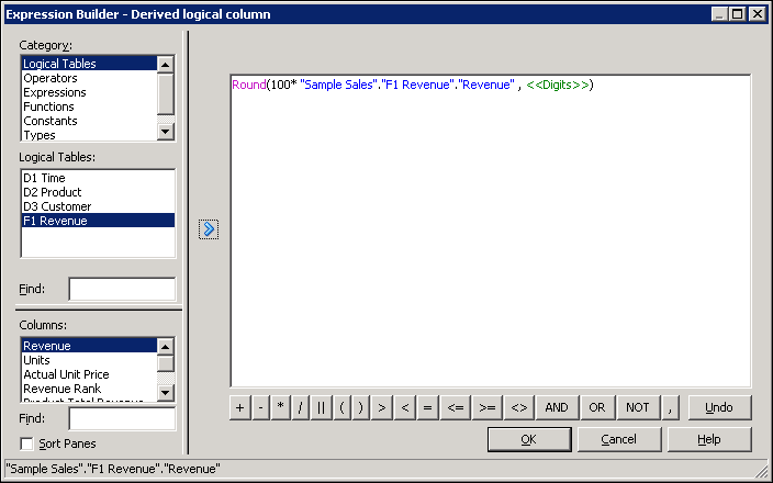 Select Logical Tables > F1 Revenue and then double-click Revenue to add it to the expression.