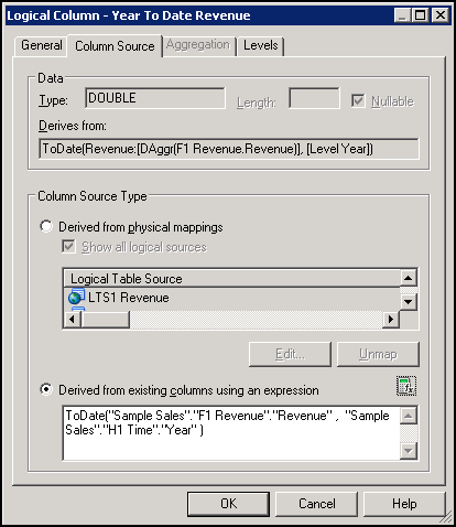 On the General tab, name the new logical column Year To Date Revenue.