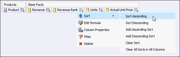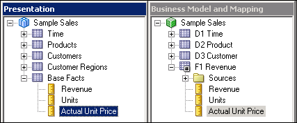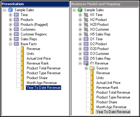 Drag the Year To Date Revenue logical column to the Base Facts presentation folder.