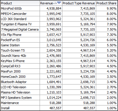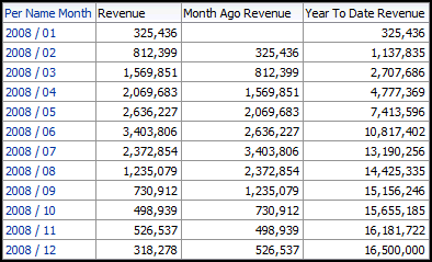 Month Ago Revenue displays revenue from the previous month. Year To Date Revenue calculates a running sum of revenue for the year on a monthly basis. -