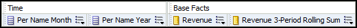 Drag the Revenue 3-Period Rolling Sum logical column to the Base Facts presentation folder.