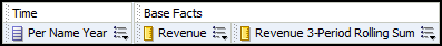 Revenue 3-Period Rolling Sum is calculated based on the year grain. A measure with the PERIODROLLING function calculates results based on the query grain.