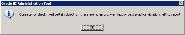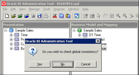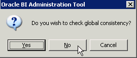Click No when prompted to check global consistency. Some of the more common checks are done in the Business Model and Mapping layer and Presentation layer. Since these layers are not defined yet, bypass this check until the other layers in the repository are built. You learn more about consistency check later in this tutorial.
