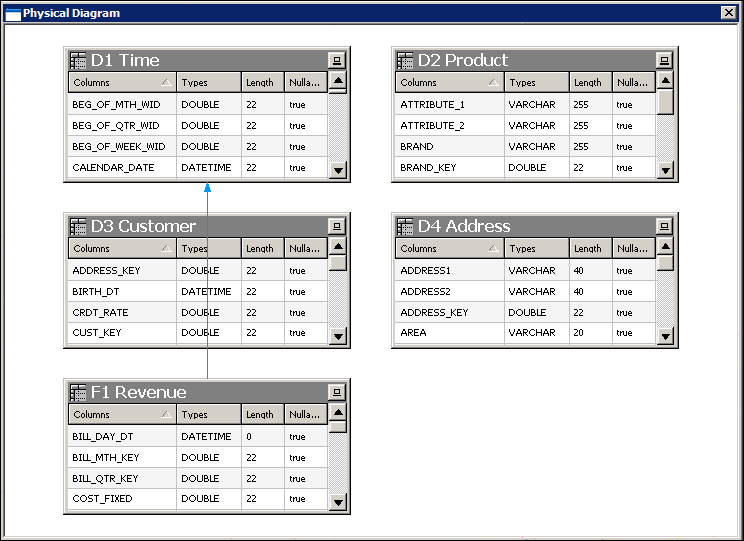 Click the F1 Revenue table and then the D1 Time table. The Physical Foreign Key dialog box opens. It matters which table you click first. The join creates a one-to-many (1:N) relationship that joins the key column in the first table to a foreign key column in the second table.