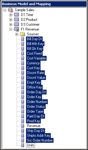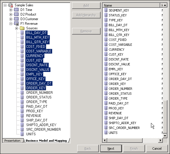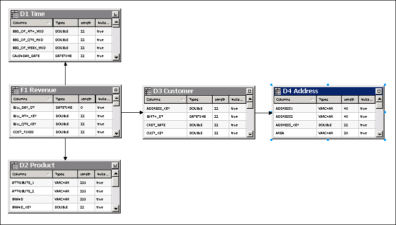 Select the D1 Time. CALENDAR_DATE column, and then select F1 Revenue.BILL_DAY_DT to join the tables. Ensure that the Expression edit box (at the bottom) contains the following expression: