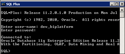 In this sub-section, you check for the existence of the S_NA_ACCT Usage Tracking table in the database Repository Creation Utility (RCU) schema. In this example, the data source name is orcl, the schema name is dev_biplatform, and the password is Oracle01. Open SQL*Plus on your desktop. Log in with the user name dev_biplatform and password Oracle01.
