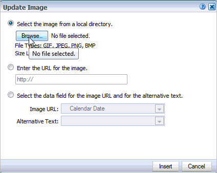 - Select a location for the new image. You can specify a file from a local directory, a URL to an image file, or a data field from your data source for the image. The following example shows a file selected from a local directory. Click Browse to select an image from the local directory.