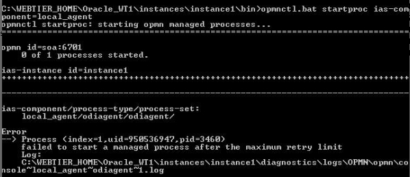 Make sure to set JAVA_HOME and ODI_JAVA_HOME in odiparams.bat to the JDK 1.6. Note: The Java path should not have spaces; if it is does, try to use the DOS syntax ~ (for example C:\Progra~1\Java\jdk1.6.0_23 for C:\Program Files\Java\jdk1.6.0_23.) Otherwise, when starting the Agent with opmnctl, it fails and the error below appears in the log file: