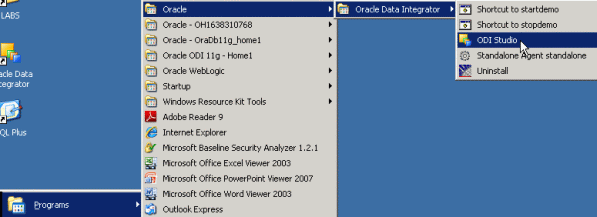 If you do not already have an existing ODI standalone agent to add to OPMN, your next step is to use the ODI Studio Topology Manager to create a standalone agent definition. To start Oracle Data Integrator: Start > Programs > Oracle ODI 11g-Home> Oracle Data Integrator > ODI Studio.