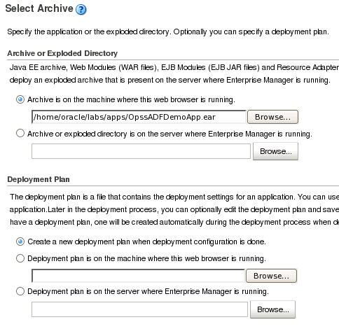 Use Deployment wizard: The FMW Control deployment wizard appears. The first step involves selecting the application you would like to deploy from the file system. In our case, the EAR file is local to where the web browser is running and where Enterprise Manager is running so either choice would work ok. In our case, we just used the "local to web browser" option and browsed for the /home/oracle/labs/apps/OpssADFDemoApp.ear file. Leave the deployment plan options as the default "Create a new deployment plan when deployment configuration is done" selection, and click Next.