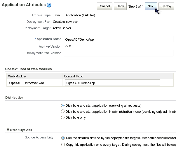The third step in the deployment wizard is for setting attributes related to an application's deployment, such as the application name and the context root of a web application. These options will be different for every application based on what components make up the application. For your application, leave the default OpssADFDemoApp as the name and context root, and click Next:
