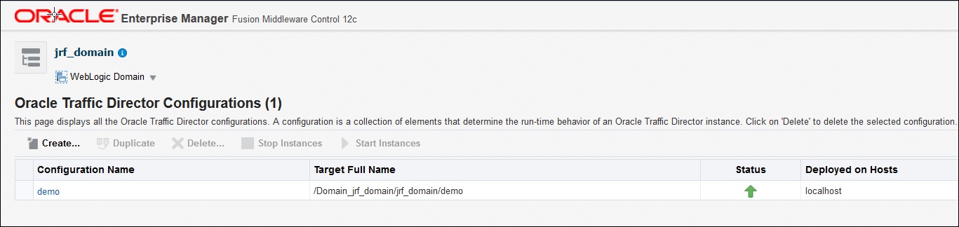 http://hostname:admin port/em) - To select your Oracle Traffic Director configuration from WebLogic Domain, select Administration, and then select OTD Configurations.