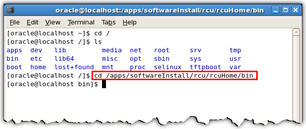 Type cd /apps/softwareinstall/rcu/rcuhome/bin and hit Enter. This is the location where you extracted the download of Repository Creation Utility to.
