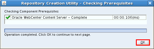The "Repository Creation Utility - Checking Prerequisites" window opens up. This is a status box for success of Repository Creation Utility table creation in the DBA.