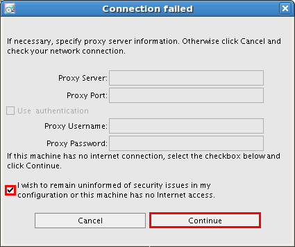 In the "Connection failed" window, select the checkbox next to "I wish to remain uninformed of security issues in my configuration or this machine has no Internet access" if no updates are desired. In the case of this OBE the VM running this training is not connected to the internet.