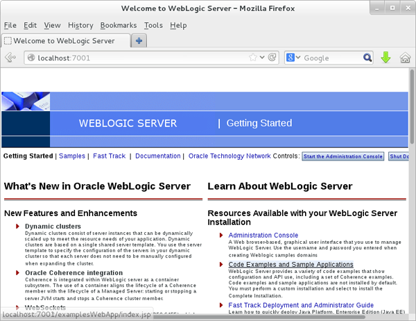 In the Learn About WebLogic Server pane, click Code Examples and Sample Applications.