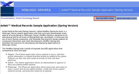 WebLogic Server provides two versions of the Avitek Medical Records sample application, one constructed with Java Server Faces (JSF) and another constructed with Spring. In this section, you learn how to run the sample applications.
