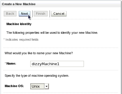 In the Create a New Machine screen, for Name enter dizzyMachine1. For Machine OS use the drop-down list to select Unix. Then click Next.