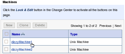 Follow the same procedure and create another machine. This time give it the Name of dizzyMachine2. Once again, set the Machine OS to Unix and the Node Manager Type to Plain. This time change the Listen Port to 5557. For the Node Manager Listen Address, enter the IP address or host name of the second computer on which your server(s) run. In this tutorial it is: host02.example.com. When finished, both machines show up in the Machines table.