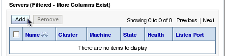 Under the Settings for dizzyMachine2, click the Configuration tab and then the Servers subtab. Above the Servers table, click the Add button. On the Add a Server to Machine screen, select the radio button Select an existing server, and associate it with this machine. Use the Select a server drop-down list to choose dizzy2. Then click Finish.