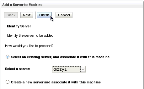 On the Add a Server to Machine screen, select the option Select an existing server, and associate it with this machine. Use the Select a server drop-down list to choose dizzy1. Then click Finish.