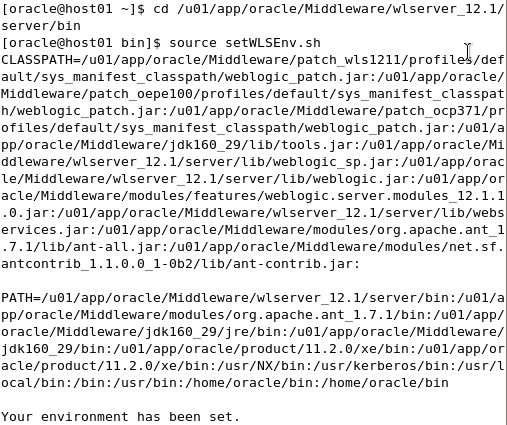Then run the setWLSEnv.sh script as follows: $ source setWLSEnv.sh This will set the PATH and the CLASSPATH so the WLST deployment script can be executed.